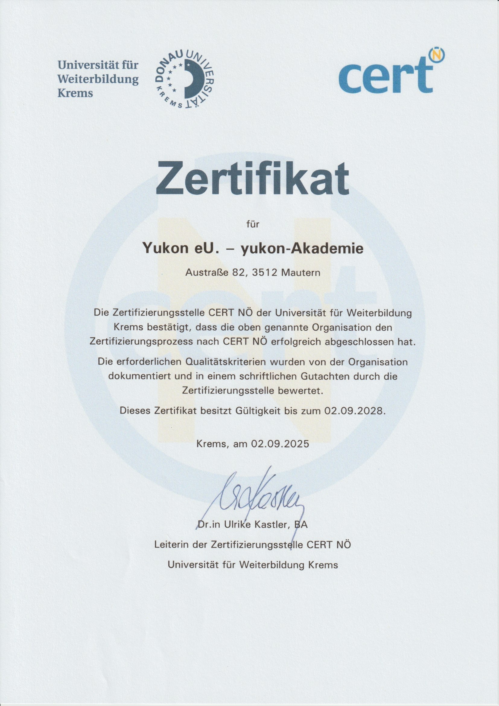 Die yukon-Akademie ist ein von CERT NÖ und Ö-Cert zertifizierter Aus- und Weiterbildungsträger und hat alle Kriterien und Prozesse bei der Zertifizierungsstelle für Qualitätssicherung und -entwicklung der Donau Universität Krems absolviert.